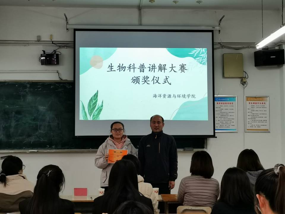比赛邀请了生物标本馆馆长张波老师,海洋生物资源教学部龙茹老师,团委书记王明洁老师,学工办主任李国伟老师,学科和科研办公室主任华昕彤老师,学工办副主任鲍家卉老师等担任评委.参赛选手是来自生技、生科、海资等专业的9位同学。本次比赛主要分为三个环节.首先由各位参赛选手依次上台展示科普PPT,并对PPT内容进行讲解;然后由各位评委老师打分;最后主持人公布比赛结果,由张波馆长与龙茹老师对参赛选手和大赛进行了点评,并为获奖学生颁奖。