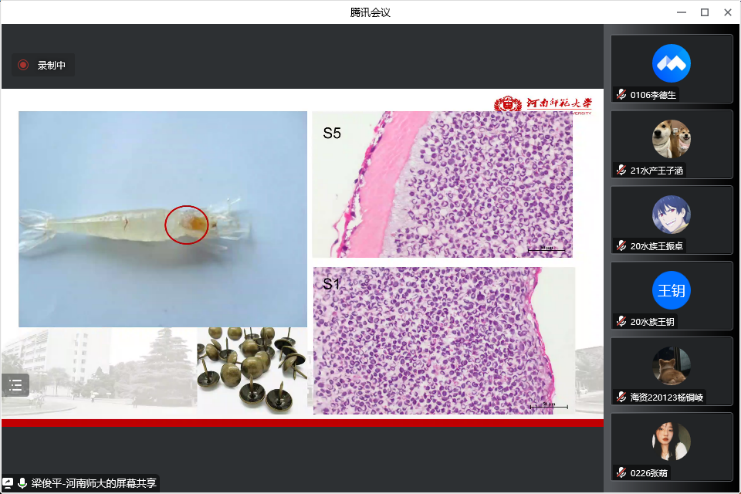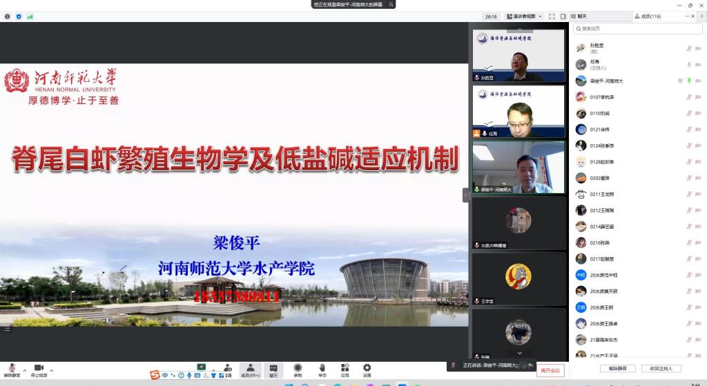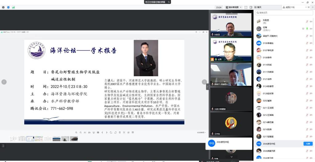 2022年10月23日上午,beat365中文官方网站三期海洋论坛活动在腾讯会议线上进行,本次活动邀请了优秀校友河南师范大学梁俊平博士给我院师生做学术报告。会议由水产科学教学部任海博士主持,水产科学教学部全体教师、渔业发展硕士研究生以及beat365本科生300余人收听了报告,学院党委副书记、副院长孙胜显出席会议。